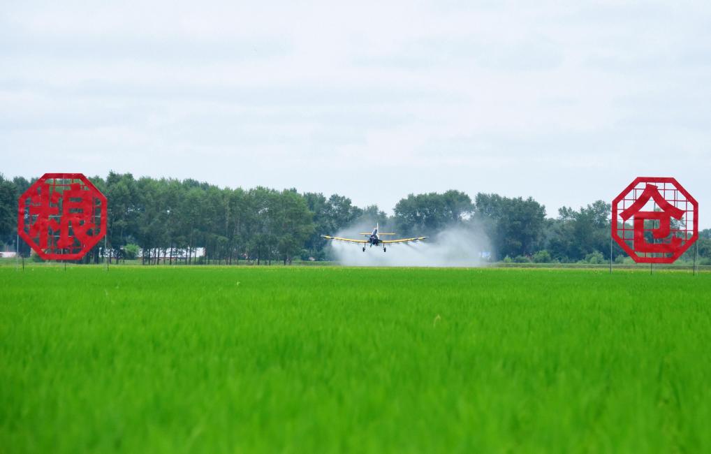 7月1日,在北大荒集團黑龍江綏濱農(nóng)場有限公司龍泉管理區(qū),一架農(nóng)用飛機進行航化作業(yè)(無人機照片)。新華社發(fā)(李興攝)