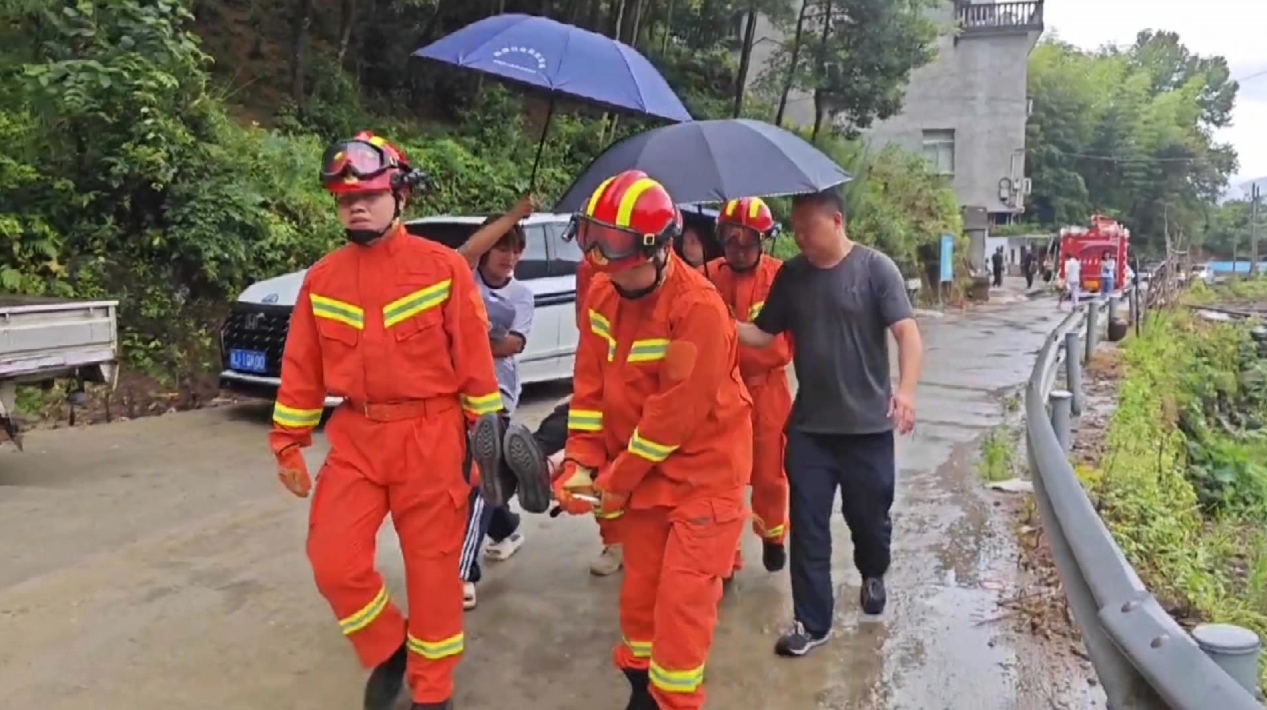 在臺(tái)州黃巖嶼頭鄉(xiāng),轉(zhuǎn)移小組在排查中發(fā)現(xiàn)上鳳村一處地質(zhì)災(zāi)害隱患點(diǎn)居住著一位92歲老人,大家立即取來?yè)?dān)架將老人慢慢抬出。在大家冒雨接力下,老人被護(hù)送至安置點(diǎn)。