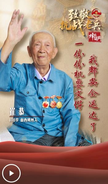 崔恭,100歲,1925年出生在山西平魯縣(今山西朔州市平魯區(qū))一個貧農(nóng)家庭。1942年參加八路軍,隸屬于晉綏分區(qū)新兵連,一個月后被選拔到雁北支隊通信排任通信員。1943年,雁北支隊撤銷后,歸屬晉綏軍區(qū)塞北軍分區(qū)警衛(wèi)連通信排,任機要通信員。1946年參加了解放朔縣城的戰(zhàn)斗。