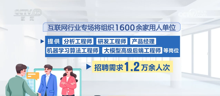 互聯(lián)網(wǎng)行業(yè)專場(chǎng)將組織1600余家用人單位,提供分析工程師、研發(fā)工程師、產(chǎn)品經(jīng)理、機(jī)器學(xué)習(xí)算法工程師、大模型高級(jí)后端工程師等崗位,招聘需求1.2萬余人次。