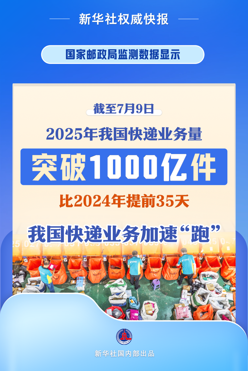 國家郵政局監(jiān)測數(shù)據(jù)顯示,截至7月9日,今年我國快遞業(yè)務量突破1000億件,比2024年提前35天。