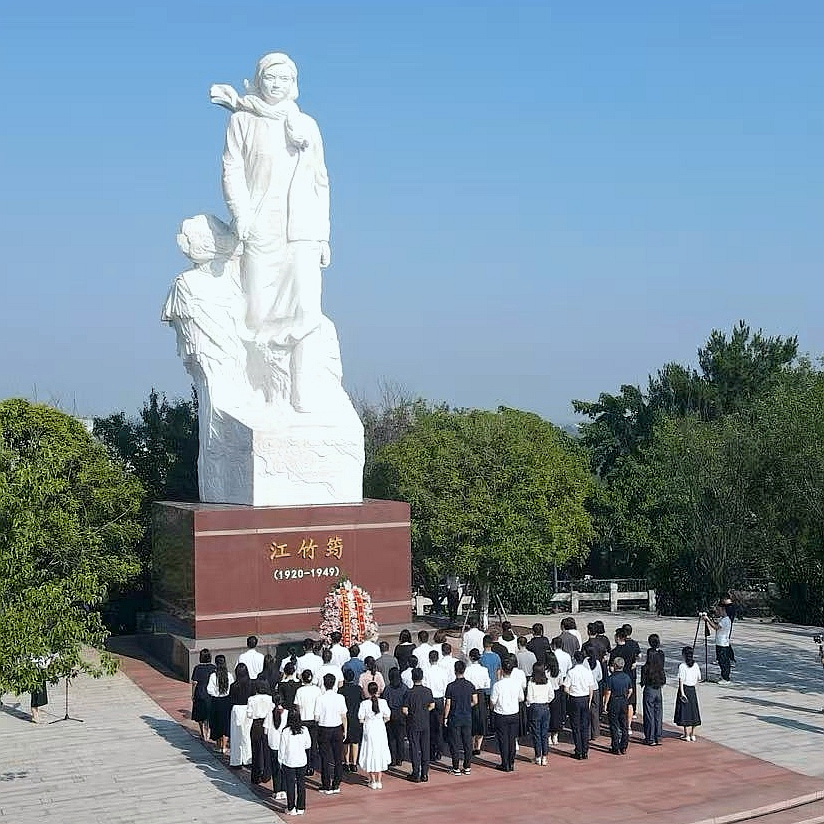 7月29日,參賽選手前往江姐故里紅色教育基地,向江姐塑像敬獻(xiàn)花籃。(主辦方供圖)