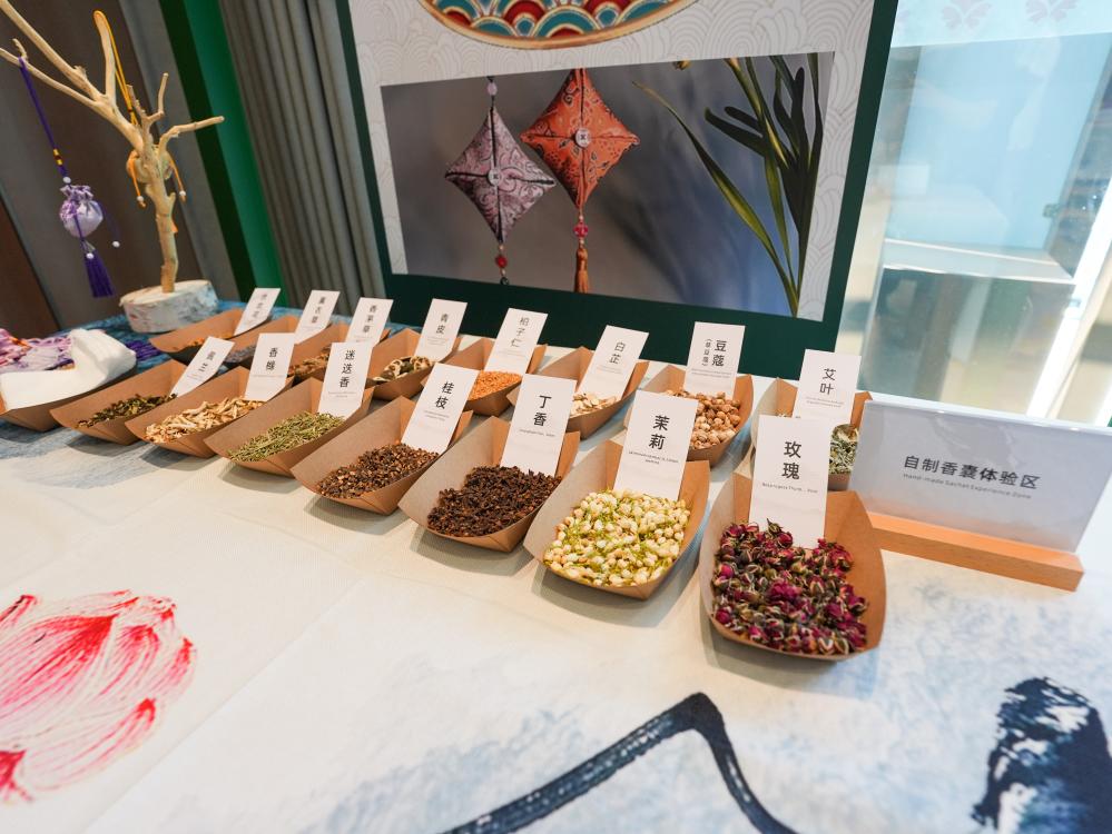 8月3日,在成都世運(yùn)會運(yùn)動員村A區(qū)中醫(yī)藥體驗(yàn)館拍攝的自制香囊體驗(yàn)區(qū)。新華社記者 王曦 攝