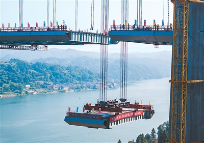 8月3日,由湖南路橋建設(shè)集團(tuán)承建的張官高速控制性工程洞庭溪沅水特大橋主橋順利合龍,為2026年全線通車奠定堅實基礎(chǔ)。張官高速公路北起張家界市永定區(qū),南至懷化市沅陵縣官莊鎮(zhèn),是國家高速公路網(wǎng)呼和浩特—北海高速公路的重要組成部分。圖為大橋施工現(xiàn)場,一塊鋼混結(jié)合梁在被緩緩提升。新華社記者 陳思汗攝