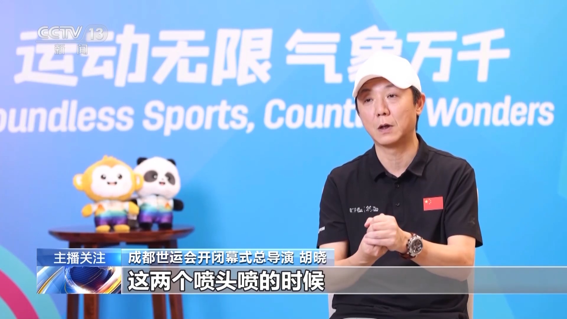 成都世運(yùn)會(huì)開閉幕式總導(dǎo)演 胡曉:乍一看都以為是里面加了個(gè)燃?xì)夤艿?。不是,它真的把天然氣融到水里去了。它是外面一根水管,里面一根氣管,這兩個(gè)噴頭噴的時(shí)候,外面的水管因?yàn)樗膲毫芫鶆?,而且足夠大,可以形成一個(gè)管壁,變成一個(gè)天然氣管道,氣就從里面出來了,而這個(gè)氣又不能太大,太大了他又把水管壁給沖破了,太小了,又沖不上去,就要找到一個(gè)水與火之間的平衡,然后在最后點(diǎn)著的瞬間,水跟火都能融到一起去燃燒,去綻放,一個(gè)噴起來,一個(gè)燃燒起來。