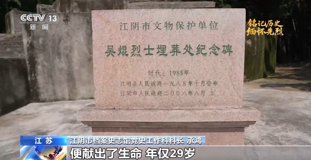 江陰市檔案史志館黨史工作科科長(zhǎng) 承鴻:他率領(lǐng)部隊(duì)進(jìn)軍的時(shí)候,遭到了國(guó)民黨軍隊(duì)的冷槍?zhuān)瑓菬j頭部中彈,未及留下只言片語(yǔ),便獻(xiàn)出了生命,年僅29歲。吳焜參加過(guò)長(zhǎng)征,歷經(jīng)艱難險(xiǎn)阻,在作戰(zhàn)和訓(xùn)練當(dāng)中,處處以身作則,率先垂范。他指揮作戰(zhàn)時(shí)經(jīng)常沖在第一線,非常勇猛,正是依靠這種精神和作風(fēng),讓新四軍成為鐵軍。