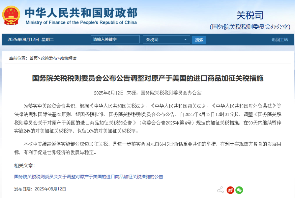 為落實(shí)中美經(jīng)貿(mào)會談共識,根據(jù)《中華人民共和國關(guān)稅法》、《中華人民共和國海關(guān)法》、《中華人民共和國對外貿(mào)易法》等法律法規(guī)和國際法基本原則,經(jīng)國務(wù)院批準(zhǔn),國務(wù)院關(guān)稅稅則委員會公布公告,自2025年8月12日12時01分起,調(diào)整《國務(wù)院關(guān)稅稅則委員會關(guān)于對原產(chǎn)于美國的進(jìn)口商品加征關(guān)稅的公告》(稅委會公告2025年第4號)規(guī)定的加征關(guān)稅措施,在90天內(nèi)繼續(xù)暫停實(shí)施24%的對美加征關(guān)稅稅率,保留10%的對美加征關(guān)稅稅率。