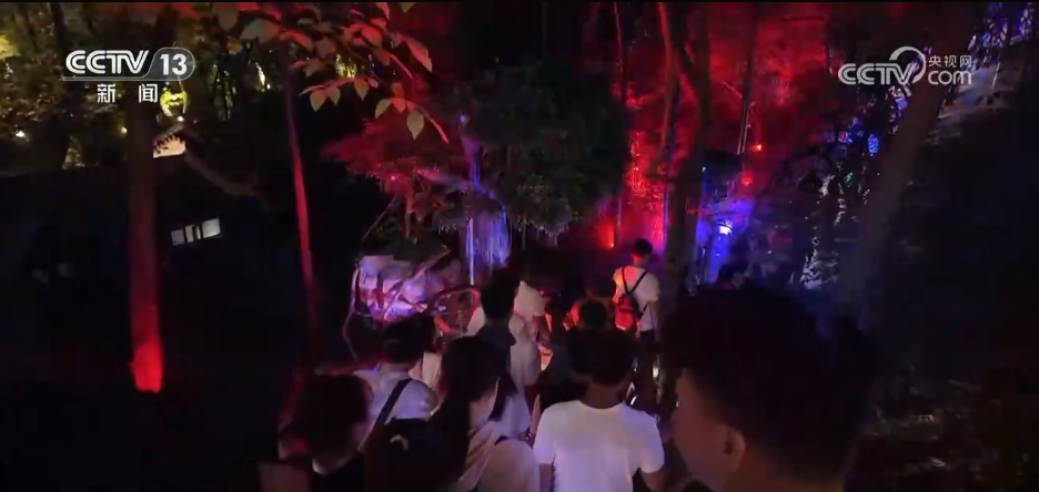 在八公山國家地質公園,不少游客選擇到森林里避暑游玩,特別是到了晚上,景區(qū)通過光影秀打造了夜間森林的游覽路線,還發(fā)放了15000余張兒童免費體驗券,吸引游客到來。