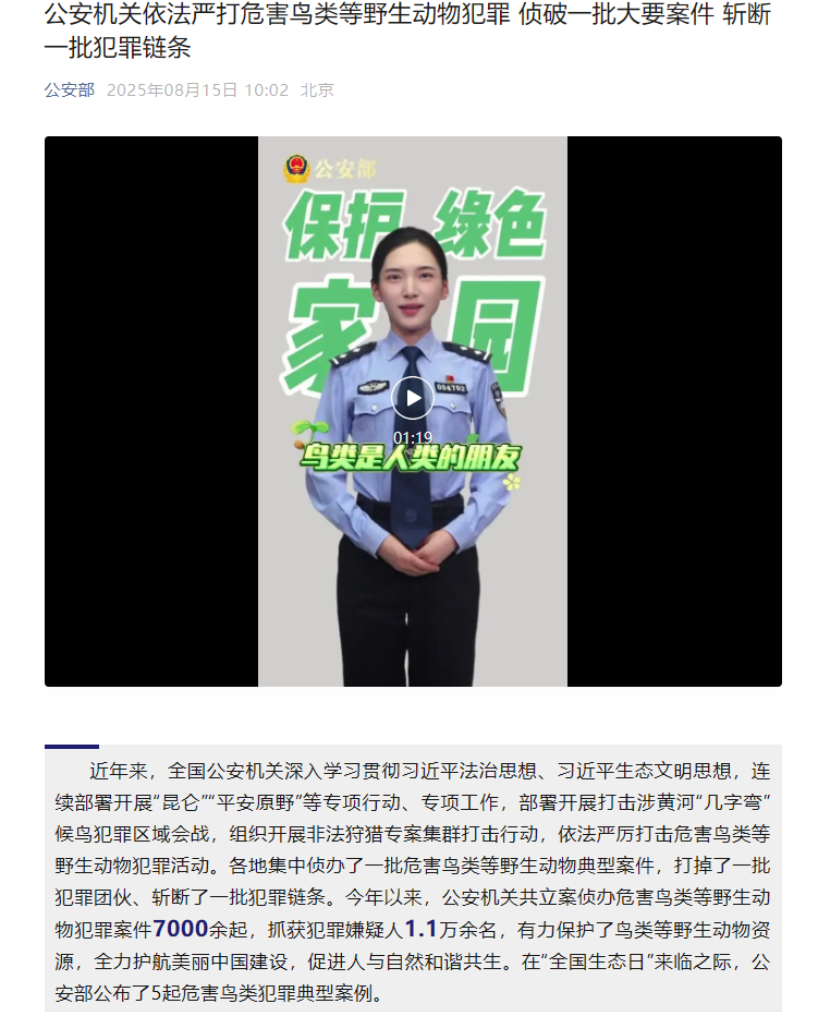 近年來(lái),全國(guó)公安機(jī)關(guān)深入學(xué)習(xí)貫徹習(xí)近平法治思想、習(xí)近平生態(tài)文明思想,連續(xù)部署開(kāi)展“昆侖”“平安原野”等專項(xiàng)行動(dòng)、專項(xiàng)工作,部署開(kāi)展打擊涉黃河“幾字彎”候鳥(niǎo)犯罪區(qū)域會(huì)戰(zhàn),組織開(kāi)展非法狩獵專案集群打擊行動(dòng),依法嚴(yán)厲打擊危害鳥(niǎo)類等野生動(dòng)物犯罪活動(dòng)。各地集中偵辦了一批危害鳥(niǎo)類等野生動(dòng)物典型案件,打掉了一批犯罪團(tuán)伙、斬?cái)嗔艘慌缸镦湕l。今年以來(lái),公安機(jī)關(guān)共立案?jìng)赊k危害鳥(niǎo)類等野生動(dòng)物犯罪案件7000余起,抓獲犯罪嫌疑人1.1萬(wàn)余名,有力保護(hù)了鳥(niǎo)類等野生動(dòng)物資源,全力護(hù)航美麗中國(guó)建設(shè),促進(jìn)人與自然和諧共生。在“全國(guó)生態(tài)日”來(lái)臨之際,公安部公布了5起危害鳥(niǎo)類犯罪典型案例。