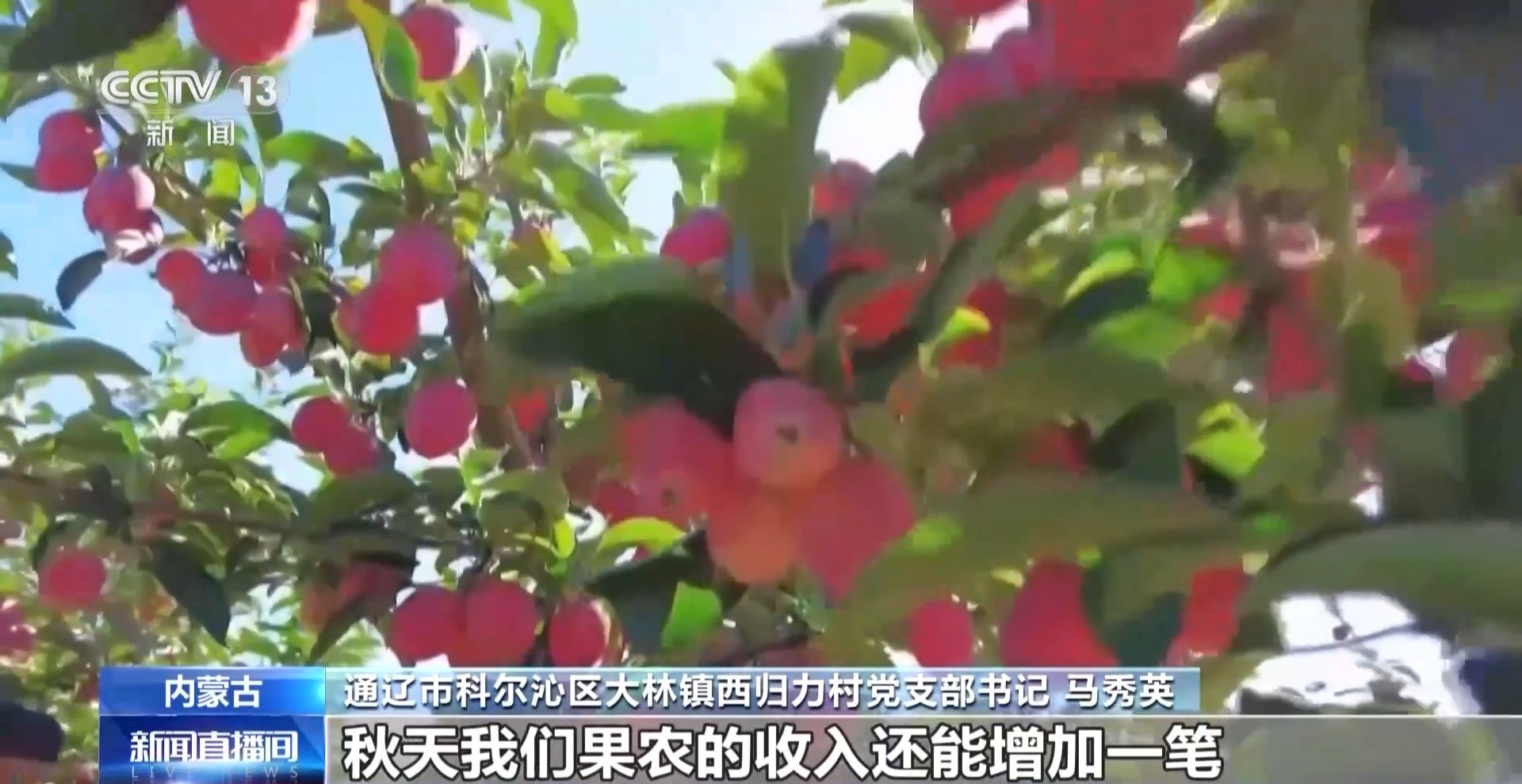 通遼市科爾沁區(qū)大林鎮(zhèn)西歸力村黨支部書記 馬秀英:今年的果長得特別好,我們引進(jìn)了深加工,秋天我們果農(nóng)的收入還能增加一筆。