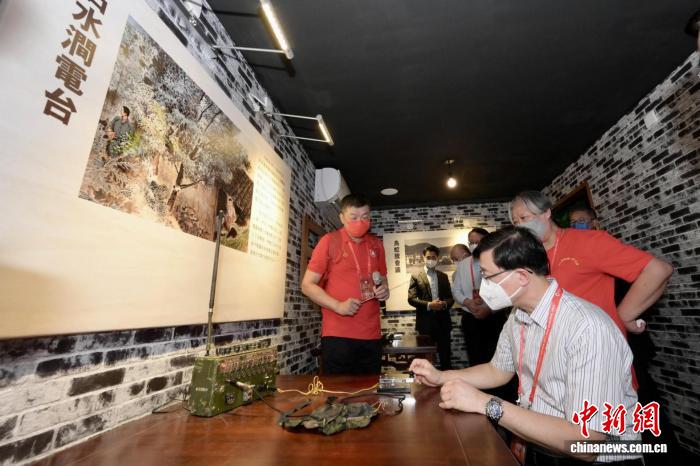 2022年9月3日,香港特區(qū)行政長官李家超(右一)出席香港沙頭角抗戰(zhàn)紀(jì)念館揭幕典禮時,在紀(jì)念館“石水澗電臺”展區(qū)體驗抗戰(zhàn)時期電臺工作。(資料圖)(香港特區(qū)政府新聞處供圖)