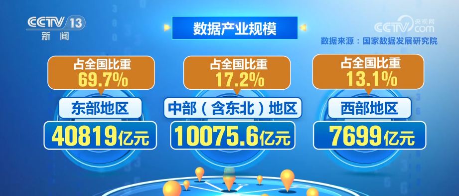 我國數(shù)據(jù)產業(yè)呈現(xiàn)梯次分布格局,東部、中部(含東北)和西部地區(qū)的數(shù)據(jù)產業(yè)規(guī)模分別為40819億元、10075.6億元和7699億元,占全國比重分別為69.7%、17.2%和13.1%。
