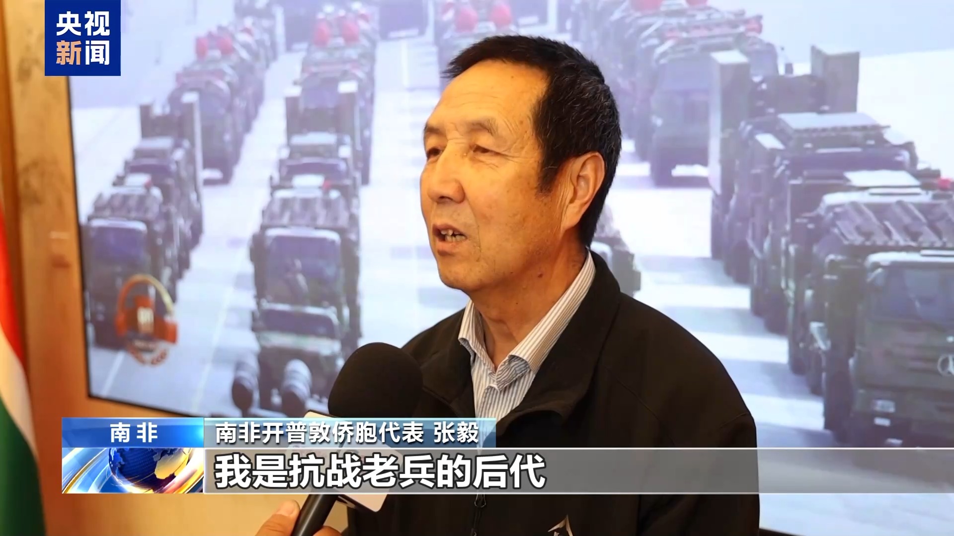 南非開普敦僑胞代表 張毅:我是抗戰(zhàn)老兵的后代,我父親1941年在冀中平原加入八路軍,曾參與多場戰(zhàn)斗。作為未經(jīng)歷戰(zhàn)爭的新一代,我們一定要繼承老一代革命先烈的精神,發(fā)揚他們的必勝信念,為世界和平貢獻(xiàn)力量。