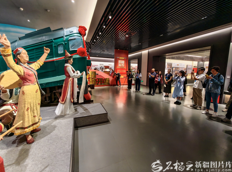 9月8日,在巴州鑄牢中華民族共同體意識主題展館,采訪團拍攝南疆火車通車雕塑。