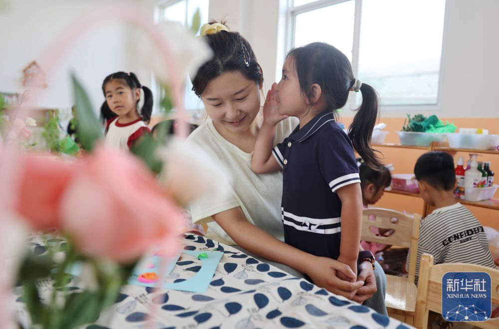 9月9日,在山東省臨沂市沂南縣銅井鎮(zhèn)中心幼兒園,小朋友在跟老師分享節(jié)日祝福悄悄話。新華社發(fā)(王彥冰攝)