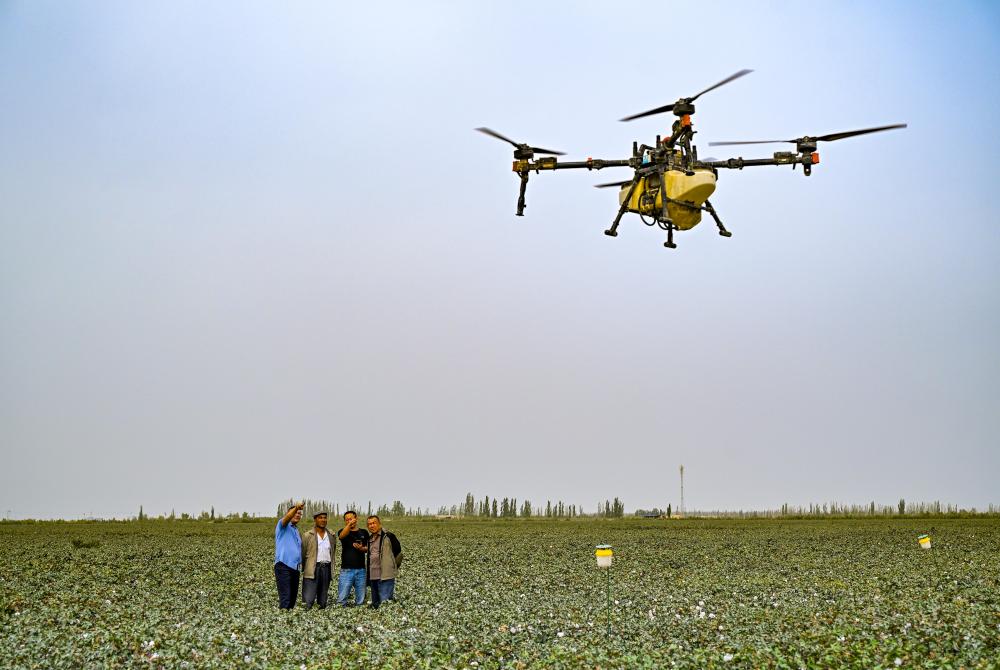 9月19日,極飛超級棉田負責人艾海鵬(右二)在尉犁縣的示范棉田里為達西村村民進行智能無人機灑藥培訓。無人化智慧農場應用農業(yè)無人機、農業(yè)無人車、遙感無人機、農機自駕儀等系列物聯(lián)設備實施“水肥一體化”管理,農民用一部手機即可操作智能設備完成多項田間管理工作。