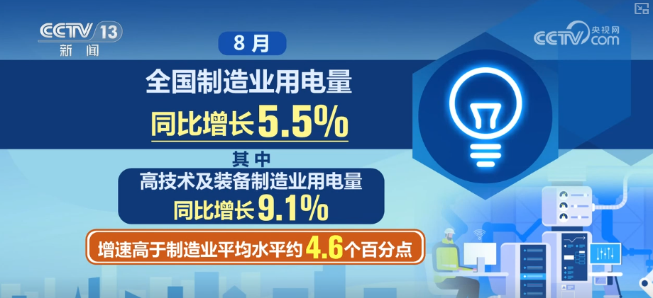 數(shù)據(jù)顯示,8月,全國制造業(yè)用電量同比增長5.5%。其中,高技術(shù)及裝備制造業(yè)用電量同比增長9.1%,增速高于制造業(yè)平均水平約4.6個(gè)百分點(diǎn)。