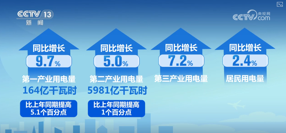 數(shù)據(jù)顯示,第一產(chǎn)業(yè)和第二產(chǎn)業(yè)用電量保持較快增長,第三產(chǎn)業(yè)和居民用電量有所回落。具體看,第一產(chǎn)業(yè)用電量164億千瓦時(shí),同比增長9.7%,比上年同期提高5.1個(gè)百分點(diǎn);第二產(chǎn)業(yè)用電量5981億千瓦時(shí),同比增長5.0%,比上年同期提高1個(gè)百分點(diǎn);第三產(chǎn)業(yè)和居民用電量分別同比增長7.2%和2.4%。