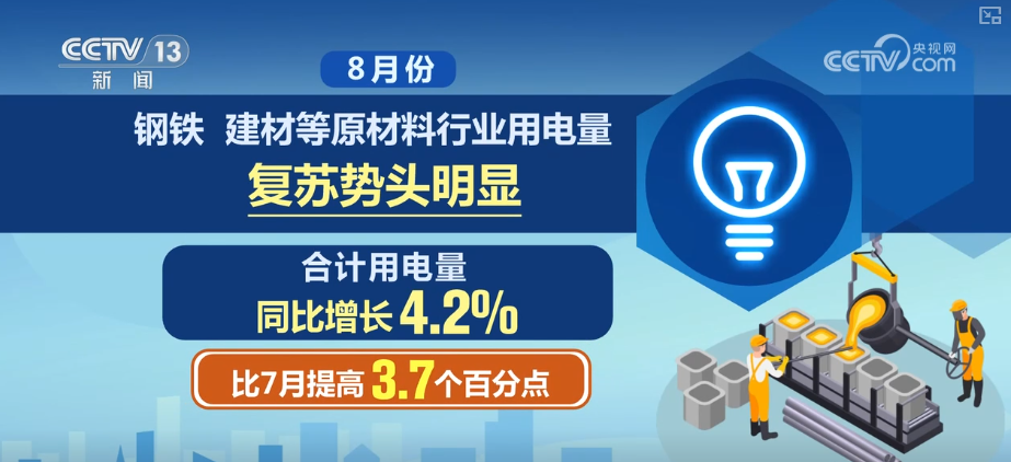 除了制造業(yè),8月份,鋼鐵、建材等原材料行業(yè)用電量復(fù)蘇勢(shì)頭明顯,合計(jì)用電量同比增長4.2%,比7月提高3.7個(gè)百分點(diǎn)。