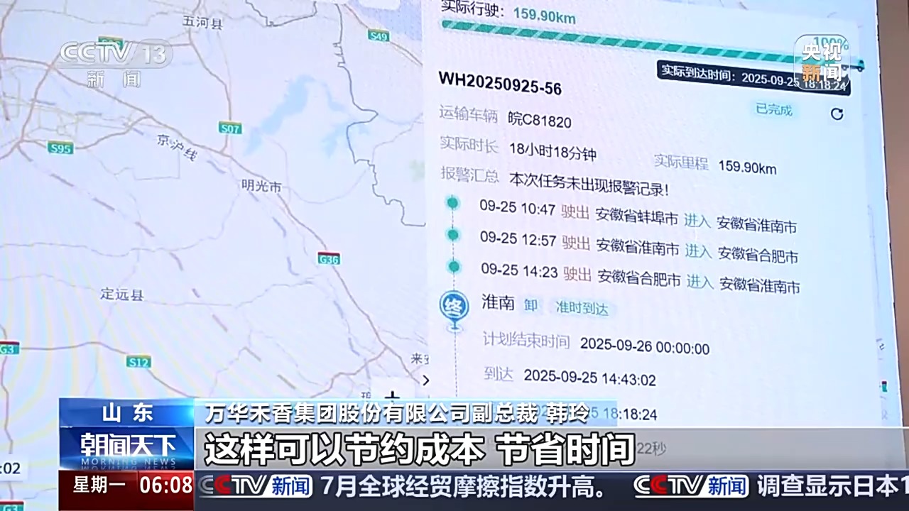 萬華禾香集團股份有限公司副總裁 韓玲:對于固定的線路,我們有大量的數(shù)據(jù)支撐之后,方便我們的司機對整個運輸?shù)木€路做一個最佳路徑的選擇,這樣可以節(jié)約成本,節(jié)省時間。