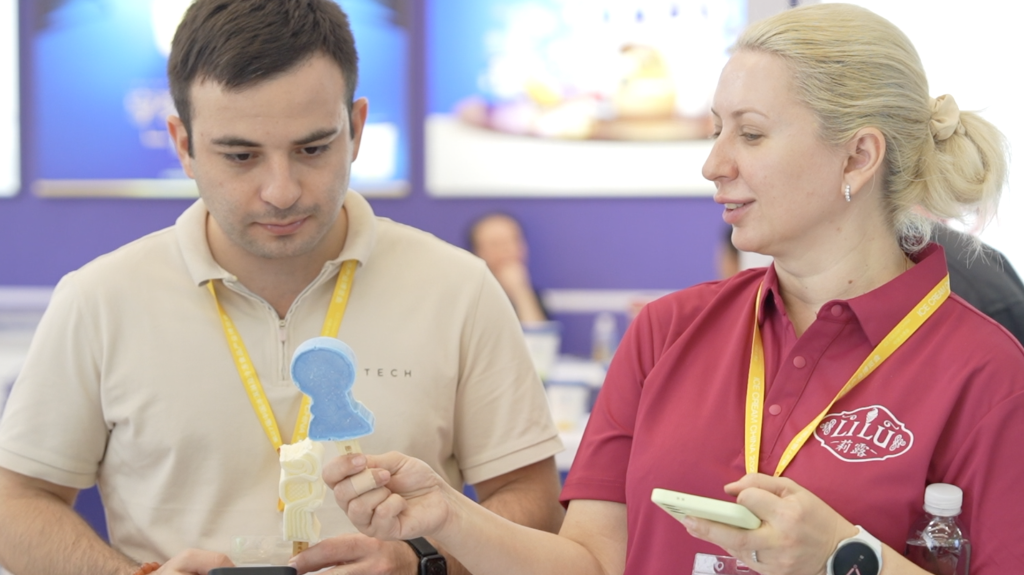 在東北大板品牌展區(qū),蜜瓜、芒果、百香果造型的水果味冰淇淋吸引了眾多客商品嘗,該系列產品遠銷新西蘭、加拿大、馬來西亞、新加坡等國家和地區(qū)。