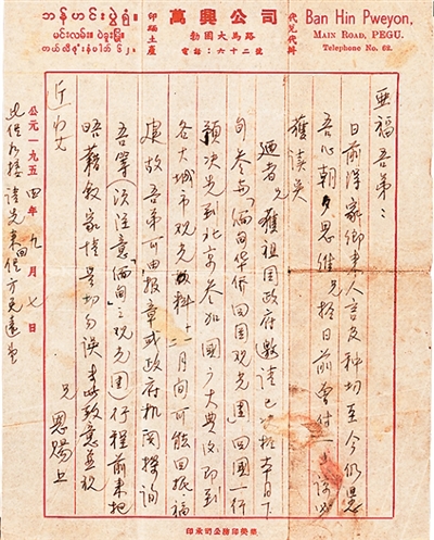 廼者兄獲祖國政府邀請,已決于本月下旬參與“緬甸華僑回國觀光團”回國一行,預決先到北京參加國慶大典,后即到各大城市觀光,料十一二月間可能回抵福建,故吾弟可由報章或政府機關探詢吾等(須注意“緬甸”之觀光團)行程,前來把晤,藉敘家情,是切勿誤。