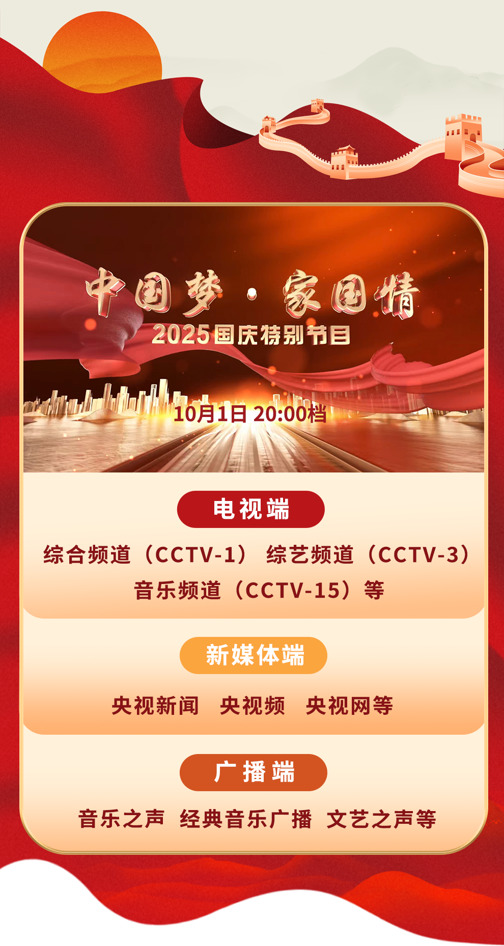 金秋潑彩山河醉,家國同輝氣象新。10月1日晚八點(diǎn),《中國夢 家國情——2025國慶特別節(jié)目》將在《我愛你中國》的大合唱中拉開大幕。特別節(jié)目走進(jìn)城市地標(biāo)與文化遺址,展現(xiàn)山河新貌與奮斗者群像。經(jīng)典曲目、交響合唱、新創(chuàng)歌曲傳遞濃濃家國情懷??箲?zhàn)老兵、奧運(yùn)冠軍、各行各業(yè)奮斗者深情講述……整場節(jié)目,洋溢著中華民族偉大復(fù)興勢不可擋的壯志豪情。