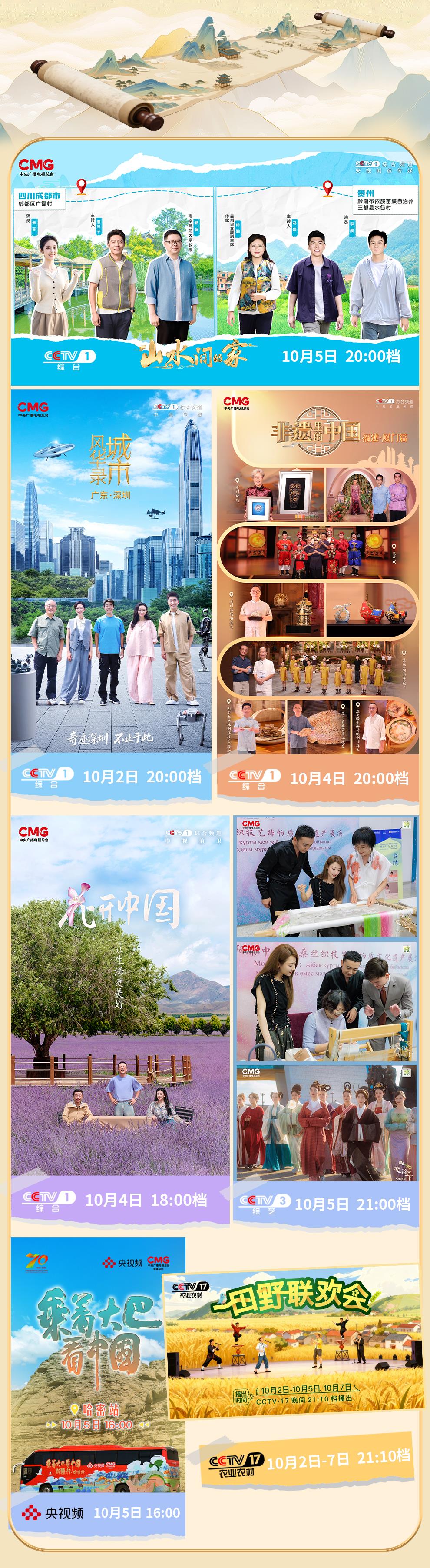 八天假期,想好去哪兒玩了嗎?來,跟著總臺去打卡!頭兩站:四川、貴州!《山水間的家(第四季)》“山水小分隊(duì)”邀你在川西林盤探韭香產(chǎn)業(yè),在黔南山鄉(xiāng)看巖椒成林。第三站:廣東。《城市風(fēng)華錄》帶你去深圳探訪全球首家機(jī)器人6S店,感受“奇跡之城”向新向好的澎湃動力。第四站:福建。珠繡、漆線雕、閩南童謠、高甲戲……看《非遺里的中國》,領(lǐng)略廈門非遺之美。第五站:新疆。從《花開中國》開啟一場跨越天山的芬芳之旅,在《衣錦天下 絲路季》發(fā)現(xiàn)絲綢之路上的中國審美,《乘著大巴游中國》探尋哈密甜美密碼。第六站:內(nèi)蒙古。在通遼參加《田野聯(lián)歡會》,體驗(yàn)鄉(xiāng)土文化新活力。這八天的旅程,你不會錯(cuò)過雄奇的風(fēng)光、古老的文化、新奇的創(chuàng)造,還有熱氣騰騰的生活。
