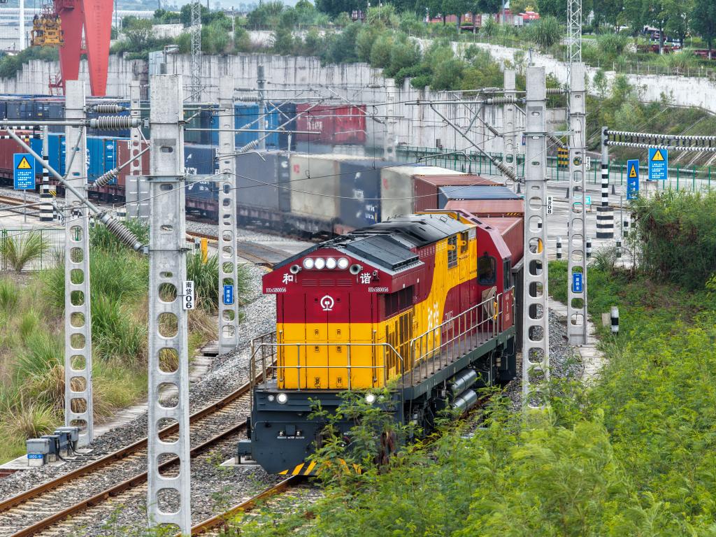 現(xiàn)場調(diào)度員逐一檢查集裝箱,龍門吊有條不紊地裝載貨物,班列司機(jī)認(rèn)真進(jìn)行發(fā)車前最后檢查……國慶中秋假期里的清晨,位于中國西部直轄市重慶的團(tuán)結(jié)村中心站延續(xù)著日常的喧鬧。
