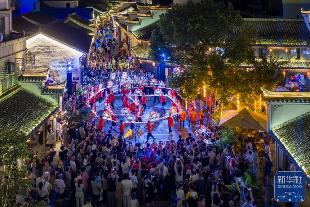 ↑ 10月5日晚,在四川省成都市雙流區(qū)黃龍溪古鎮(zhèn),民間藝人為游客表演非遺“火龍燈舞”。新華社發(fā)(李向雨攝)