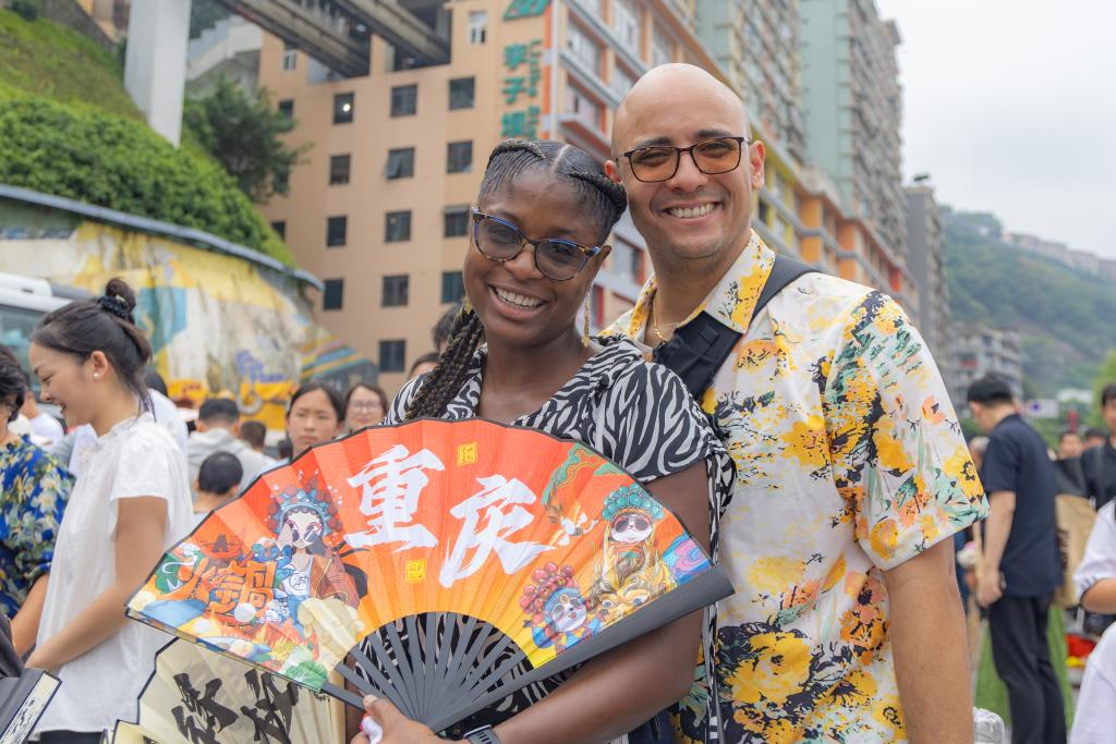 10月3日,加拿大游客克里斯提安(左)和家人在重慶市渝中區(qū)李子壩游玩。新華社記者 黃偉 攝