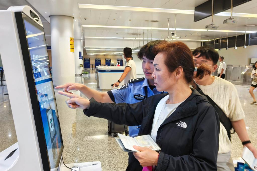 10月1日,在重慶江北國(guó)際機(jī)場(chǎng),重慶出入境邊防檢查總站民警幫助韓國(guó)旅客填寫(xiě)入境信息。新華社發(fā)(曾言延 攝)