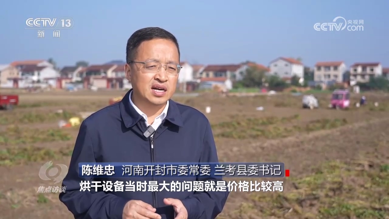 河南開封市委常委、蘭考縣委書記陳維忠:“烘干設備當時最大的問題是價格比較高,一般在1毛左右,后來我們統一談,給烘干的優(yōu)惠政策,就壓到(每斤)5分,讓老百姓接受,我們也(給農機企業(yè))補貼一點,給點政策?!?/p>