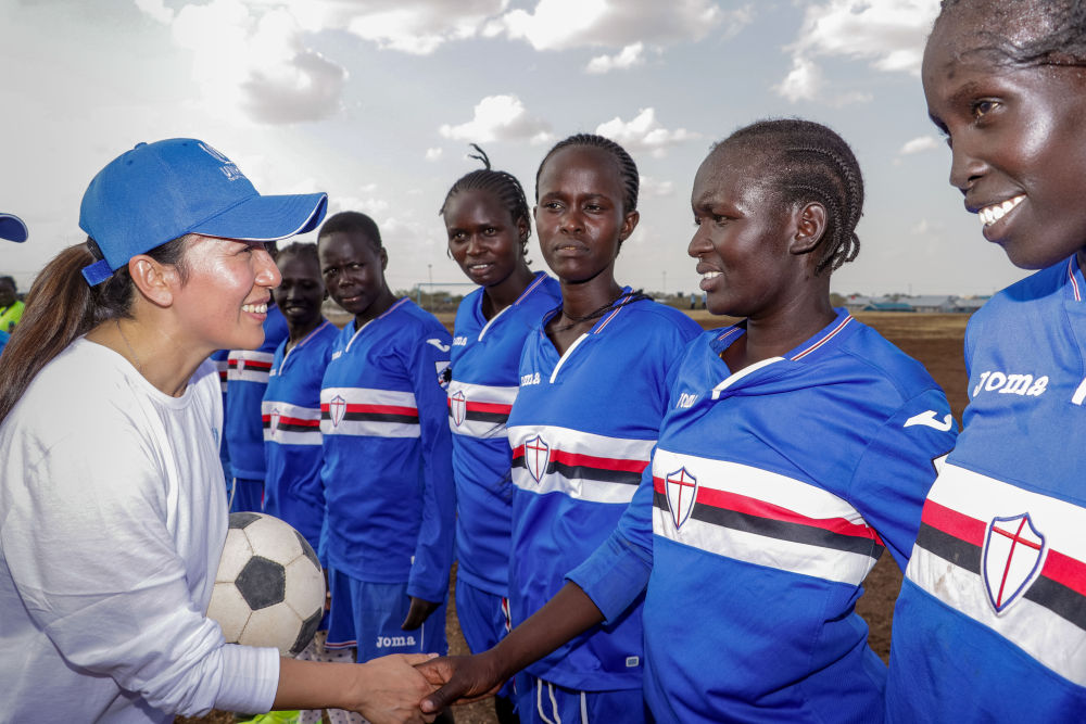 2024年2月21日,聯(lián)合國難民署親善大使、奧運冠軍楊揚(左前)與卡庫馬難民營女子足球隊隊員交流。新華社發(fā)(聯(lián)合國難民署供圖)