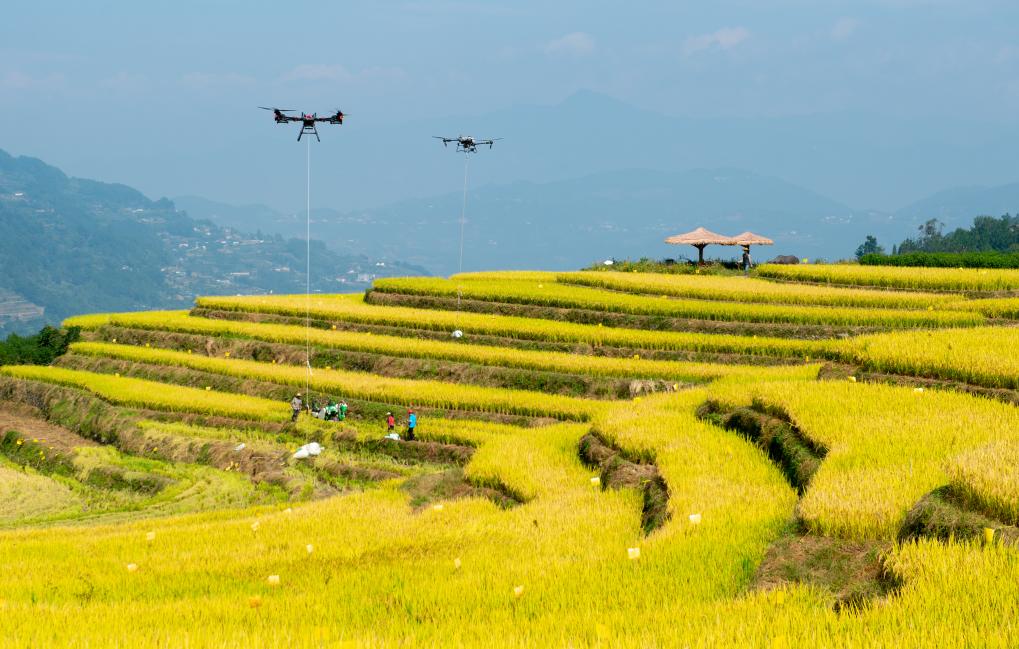 10月10日,湖北省秭歸縣沙鎮(zhèn)溪鎮(zhèn)長春村村民用無人機(jī)轉(zhuǎn)運(yùn)收獲的水稻(無人機(jī)照片)。新華社發(fā)(雷勇攝)