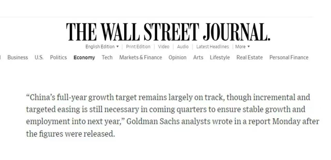 美國《華爾街日報(bào)》報(bào)道顯示,2023年前三季度中國GDP同比增長5.2%,意味著"5%左右"的年度增長目標(biāo)已基本達(dá)成。報(bào)道援引高盛分析師觀點(diǎn)稱,雖然未來幾個季度仍需實(shí)施漸進(jìn)式、結(jié)構(gòu)性的寬松政策,但全年經(jīng)濟(jì)增速仍將總體符合預(yù)期。