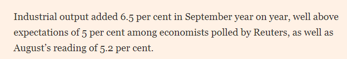 英國《金融時(shí)報(bào)》的文章分析說,9月規(guī)模以上工業(yè)增加值同比增長6.5%,顯著高于路透社調(diào)查經(jīng)濟(jì)學(xué)家預(yù)期的5%及8月的5.2%。荷蘭國際集團(tuán)(ING)經(jīng)濟(jì)學(xué)家分析稱,超預(yù)期表現(xiàn)主要源于外需拉動。文章說,上周,海關(guān)數(shù)據(jù)顯示,中國出口保持韌性,9月同比增長8.3%,對東南亞等地區(qū)出口持續(xù)增長。