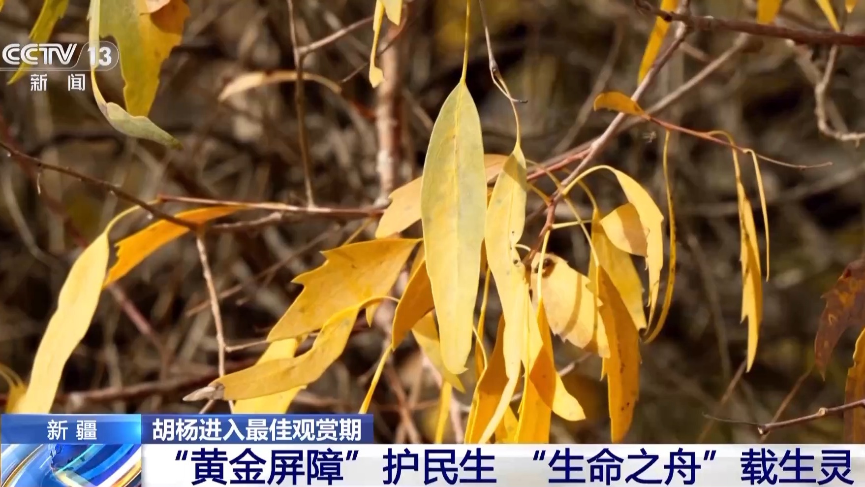 總臺記者 周宇:新疆沙雅縣擁有著全世界面積最大的野生胡楊林。這里的胡楊林進入了最佳的觀賞時期。當我們走近胡楊,會發(fā)現同一棵樹上擁有著不同形狀的葉子:
