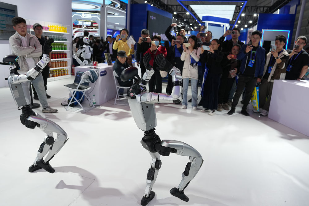↑ 11月6日,在2025年世界互聯(lián)網(wǎng)大會“互聯(lián)網(wǎng)之光”博覽會現(xiàn)場,一家企業(yè)工作人員展示人形機器人同步模仿精細動作。新華社記者 黃宗治 攝
