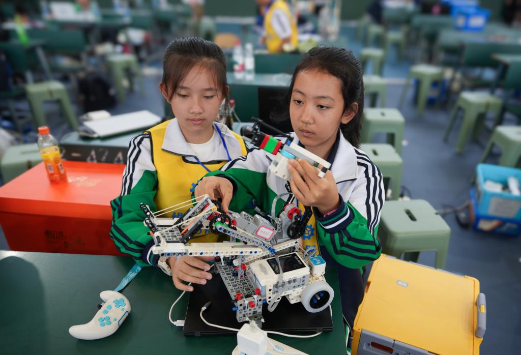 5月31日,兩名參賽選手在全國(guó)青少年科技教育成果展示大賽云南省區(qū)域賽上調(diào)試比賽用的機(jī)器人。新華社記者 陳欣波 攝