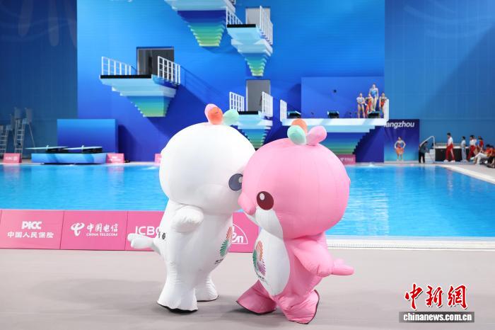 11月11日,第十五屆全國運(yùn)動(dòng)會(huì)跳水項(xiàng)目女子3米跳板決賽在廣東省奧體中心游泳跳水館舉行。圖為比賽前,十五運(yùn)會(huì)吉祥物帶來暖場表演。 中新社記者 陳楚紅 攝