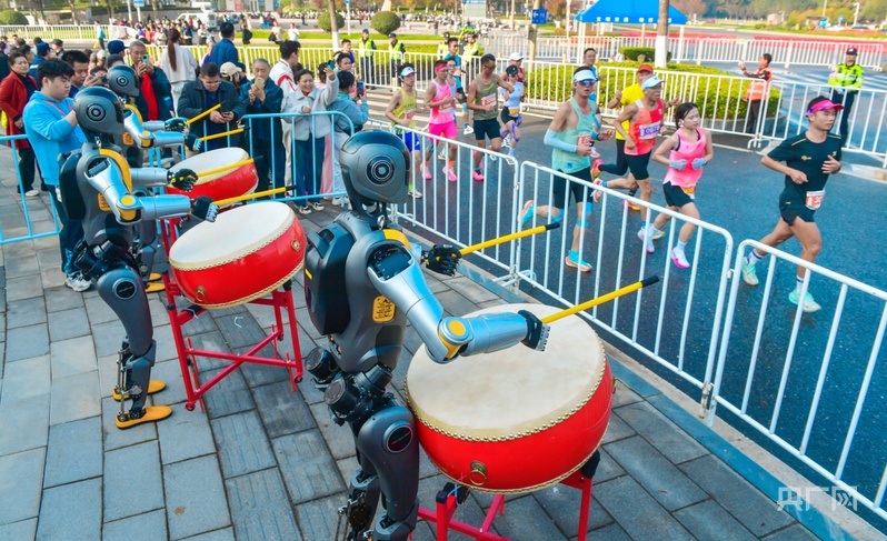 光谷馬拉松現(xiàn)場(chǎng),人形機(jī)器人為選手加油(央廣網(wǎng)發(fā) 光谷馬拉松組委會(huì)供圖)