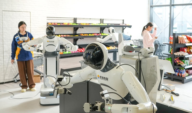 人形機(jī)器人在超市零售場(chǎng)景應(yīng)用訓(xùn)練(央廣網(wǎng)記者鄧子依 攝)
