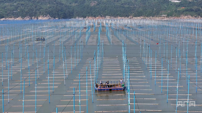 清晨的蒼南海灣,霧氣還未散盡,成片的紫菜養(yǎng)殖插桿隨波起伏。