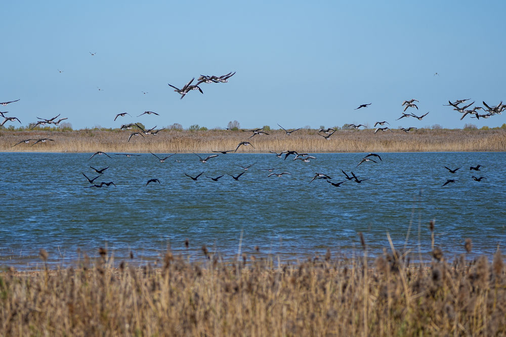 2025年11月13日,越冬候鳥在山東黃河三角洲國家級自然保護(hù)區(qū)飛翔。新華社記者 朱崢 攝