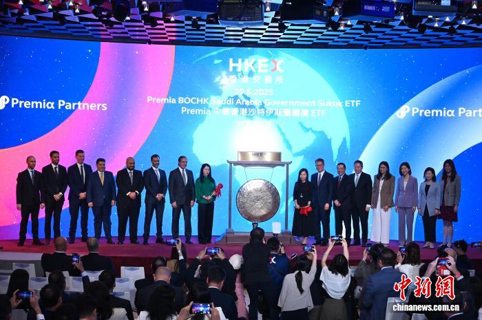 2025年5月29日,香港交易及結(jié)算所有限公司與沙特阿拉伯證券交易所集團(tuán)在香港合辦“香港——沙特資本市場論壇”。現(xiàn)場亦舉行Premia中銀香港沙特伊斯蘭國債交易所買賣基金(ETF)在香港上市的敲鑼儀式。圖為香港特區(qū)政府財政司司長陳茂波(右七)等嘉賓出席敲鑼儀式?!≈行律缬浾?李志華 攝