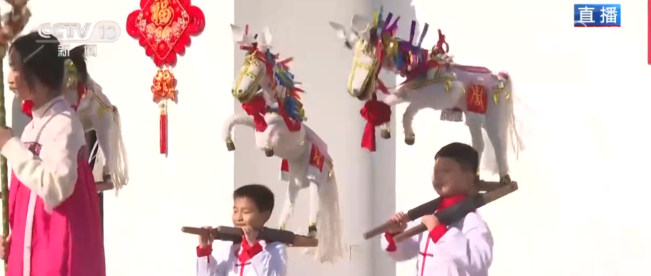 逛得盡興,更有好戲看!市集舞臺區(qū)的非遺民俗表演,表演者都是小朋友。首先登場的是背馬表演,它是國家級非遺“河上龍燈勝會”的重要組成部分。孩子們身上背著裝飾精美的“竹馬”,踏著鼓點昂首前行,它們也是龍燈隊伍的“開路先鋒”,瞬間把熱鬧氛圍給拉滿。