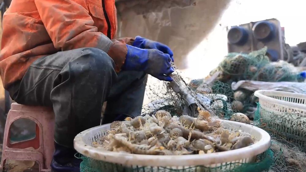 在無棣縣埕口鎮(zhèn),漁民清晨便駕船出海。隨著漁網(wǎng)收起,一只只活蹦亂跳的琵琶蝦躍上甲板。漁民隨即進(jìn)行分揀、清洗和裝筐。