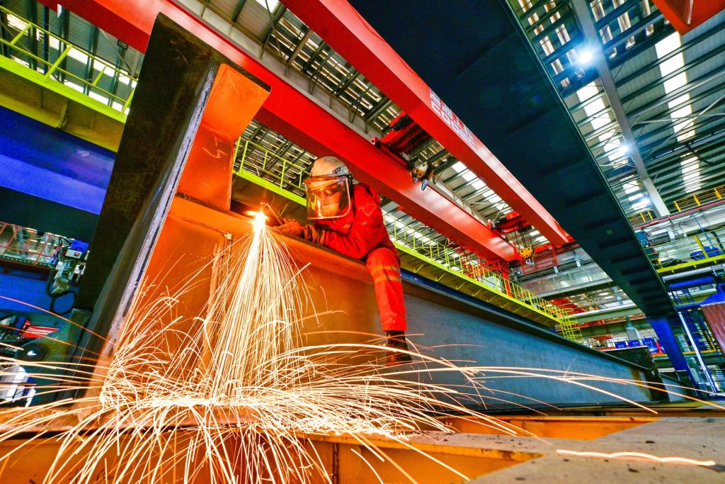 1月19日,在天津市濱海新區(qū),海上油氣平臺(tái)建設(shè)工人進(jìn)行氣割作業(yè)。新華社發(fā)(杜鵬輝攝)
