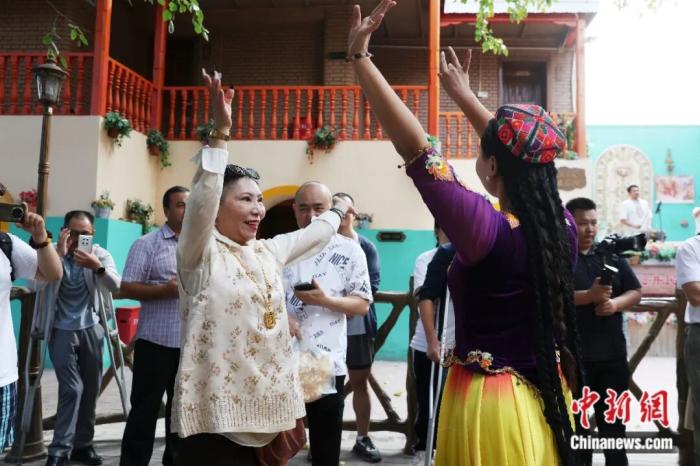 2025年9月10日,新疆吐魯番坎兒井民俗園景區(qū),游客與表演者共舞。中新社記者 王紫儒 攝